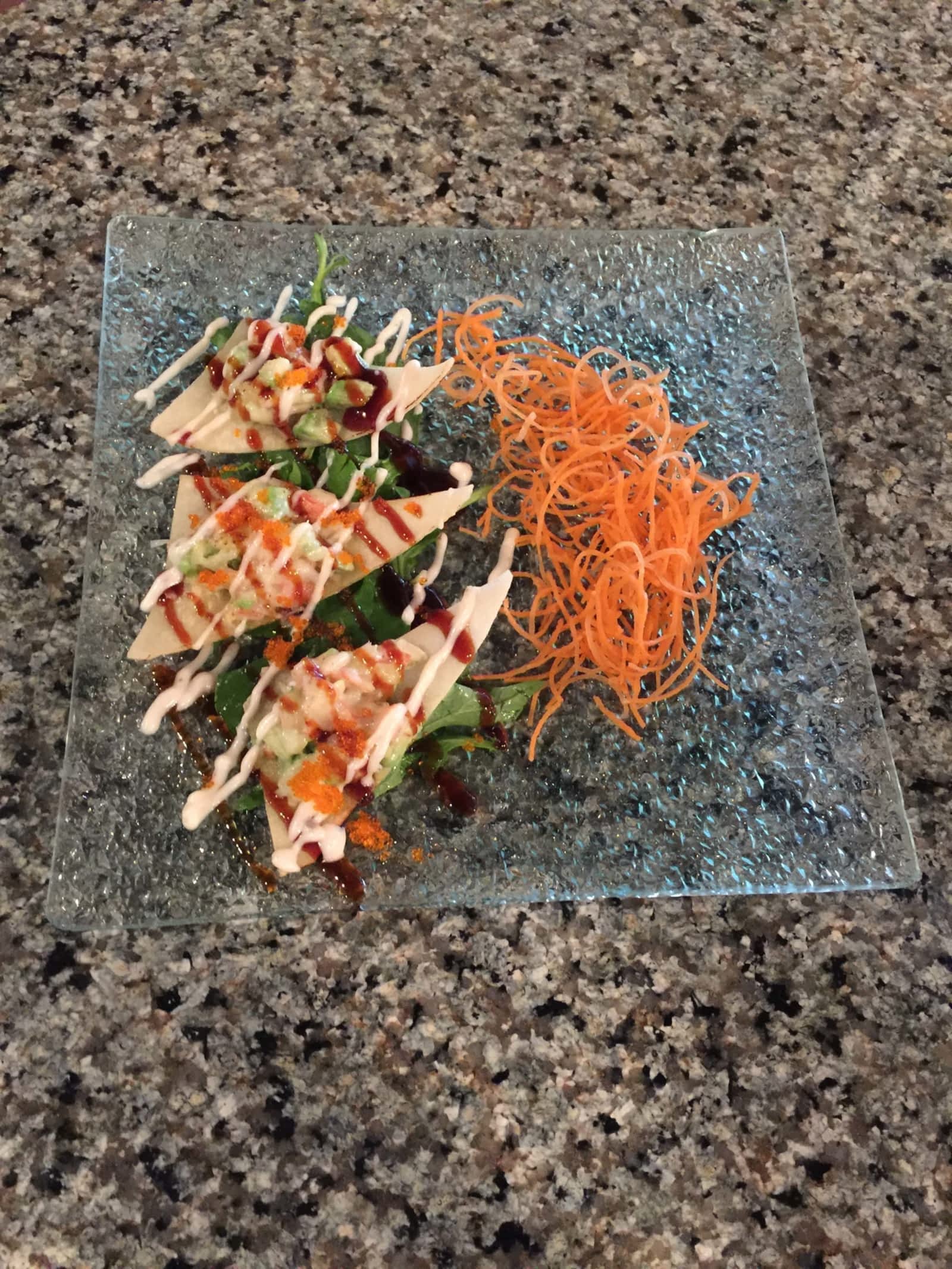 thon, avocat, massago, tempura et sauce piquante